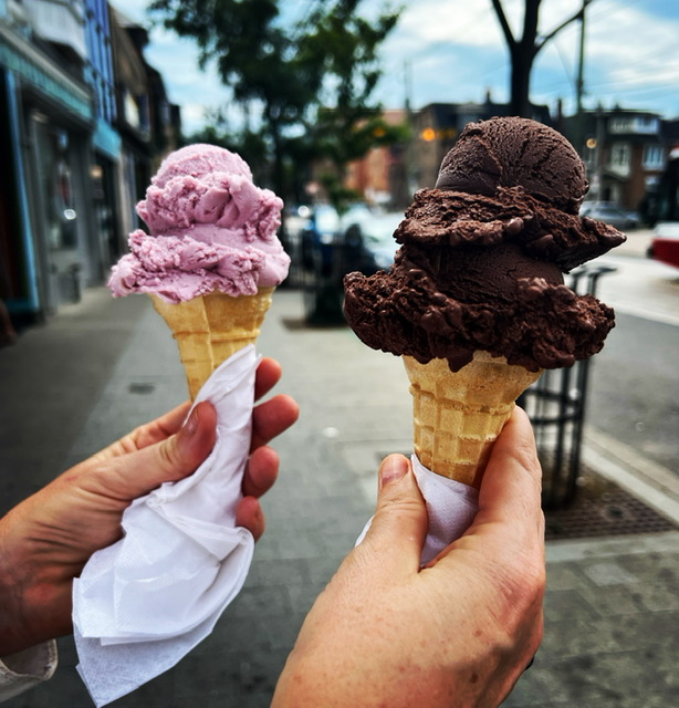 The difference between a kiddie cone and a regular or large cone has a significant impact on calories but no impact on enjoyment … infact we often feel “stuffed” “sick” or “bloated” if we over consume and then Comes the guilt and shame