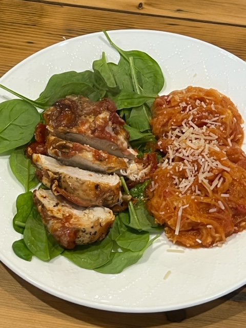 Serve with your favourite sides – In this pic I served on top a bed of spinach with a side of spaghetti squash tossed in the left over marinara sauce and topped with parmesan cheese.