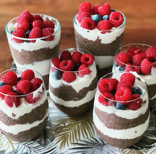 Once your chia pudding is set (thick) prepare your layered parfaits by layering chia pudding and yogurt into small containers or jars and continuing until your 3/4 containers are full. If eating immediately top with fresh berries if not cover the containers with airtight lids and keep in the fridge up to 4 days – when ready to eat top with berries and enjoy!