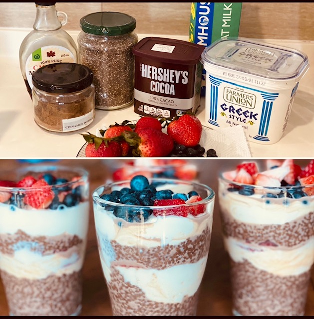 To make your chia pudding- Add all ingredients expect for the yogurt and Berries to a large container or bowl with a lid. Mix well cover and let set in Fridge for 4 hours or over night.