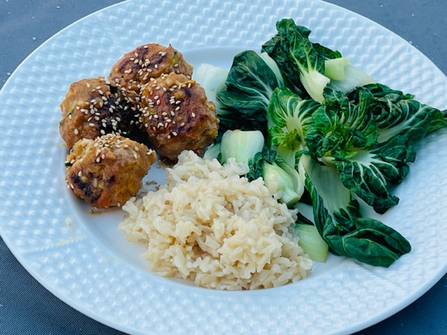 - Top your meatballs with the glaze sprinkle with sesame seeds and serve with your rice and greens