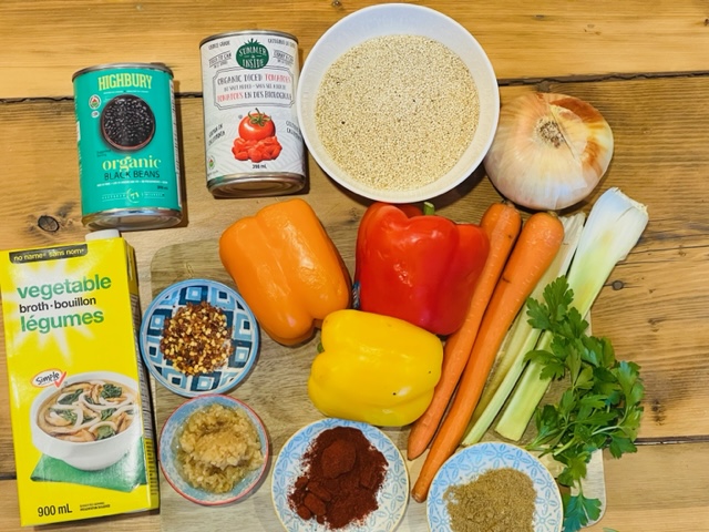 - Add quinoa, black beans, tomatoes and vegetable stock to the pot