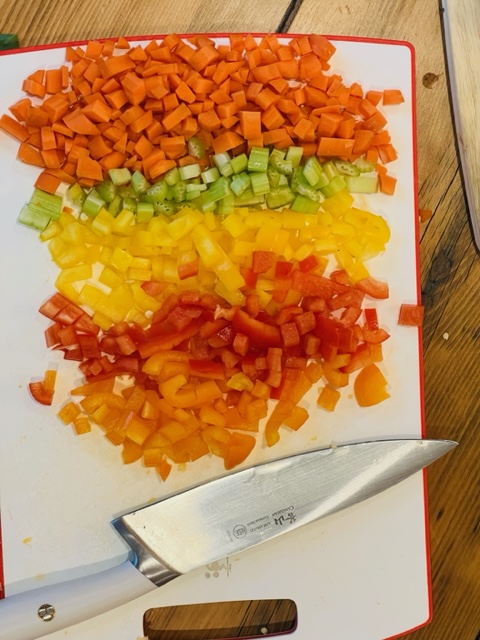 - while onion is cooking dice your remaining veggies