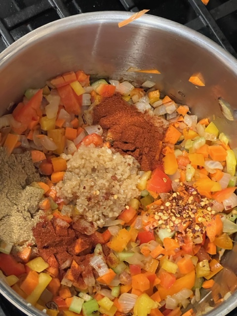 - once onion is soft and slightly golden add the remaining diced vegetables and spices stir and sauté for 3-5 mins