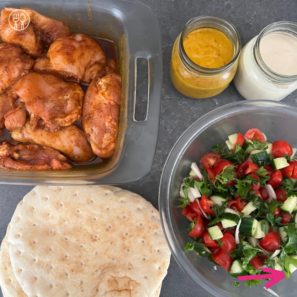 - Prepare the chicken shawarma: In a bowl, mix the chicken thighs with olive oil and spices. Massage the chicken well and let it sit in the fridge for at least one hour (max overnight). Take the chicken out from the fridge 30 minutes before cooking.