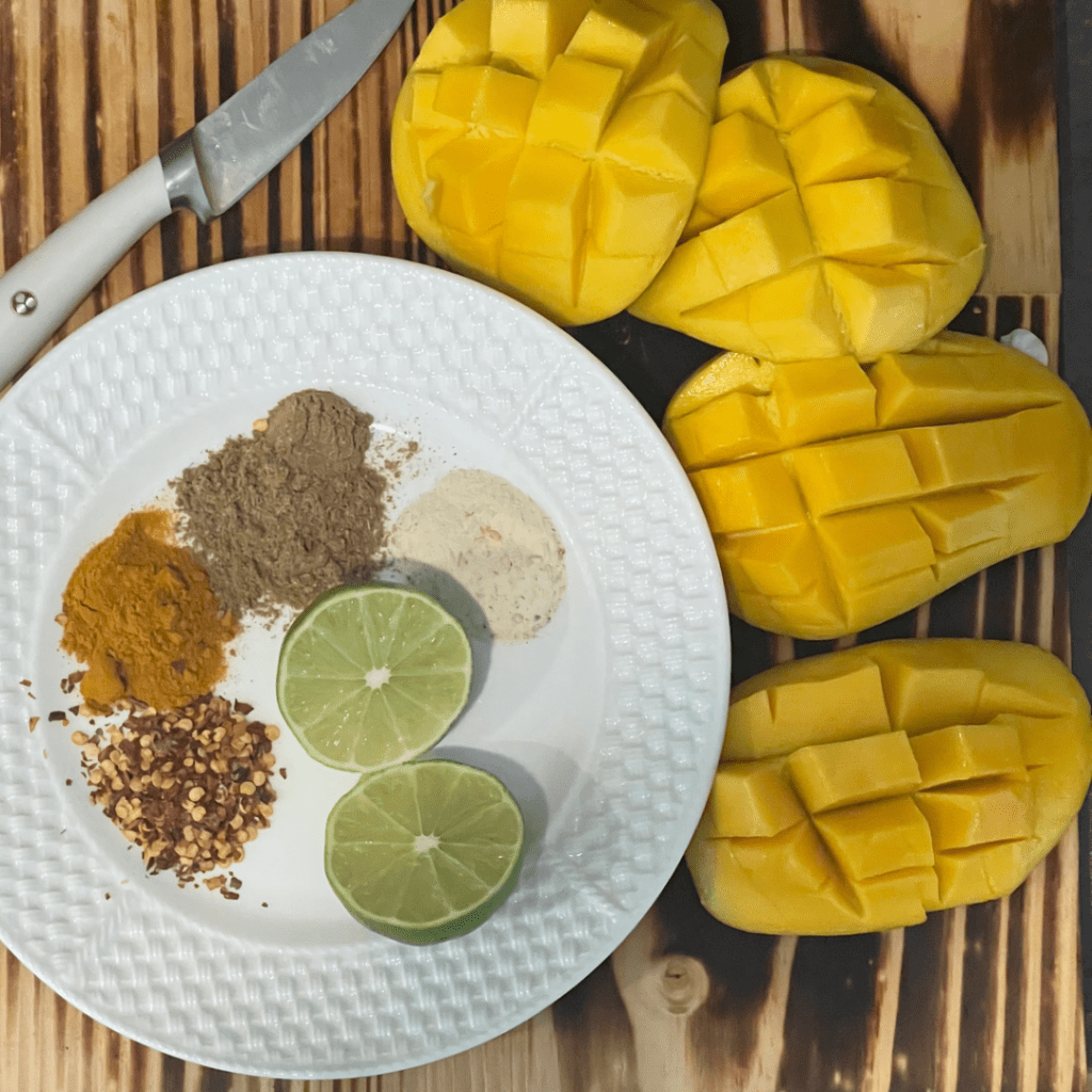 - Prepare the amba: remove the mango peel (To cut a mango, start by standing it upright and slice off one thin side as close to the seed as possible. Repeat on the other side. Then, score the flesh of each half in a crisscross pattern and scoop out the cubes with a spoon – remove peel from remains flesh rod the pit with a pairing knife and cut any excess usable flesh) In food processor blend the mango with the lime vinegar and spices until smooth.
