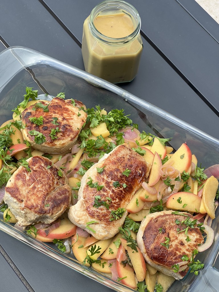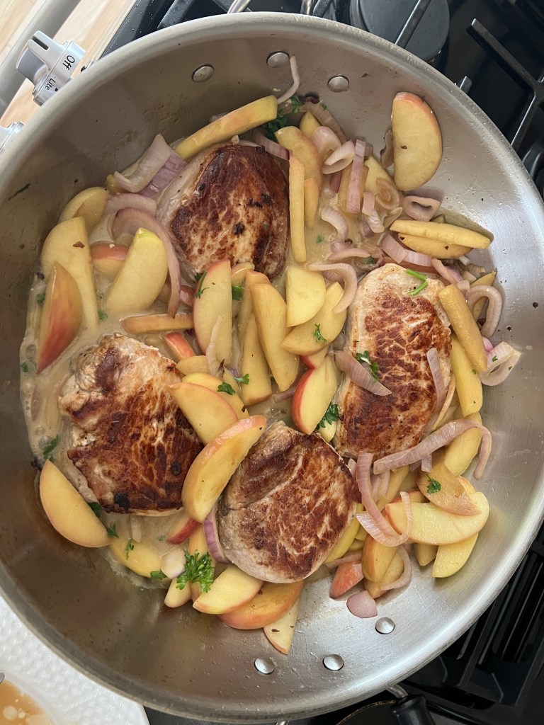 Slide pork chops back into the pan, nestling them down in between the apples.