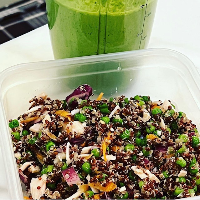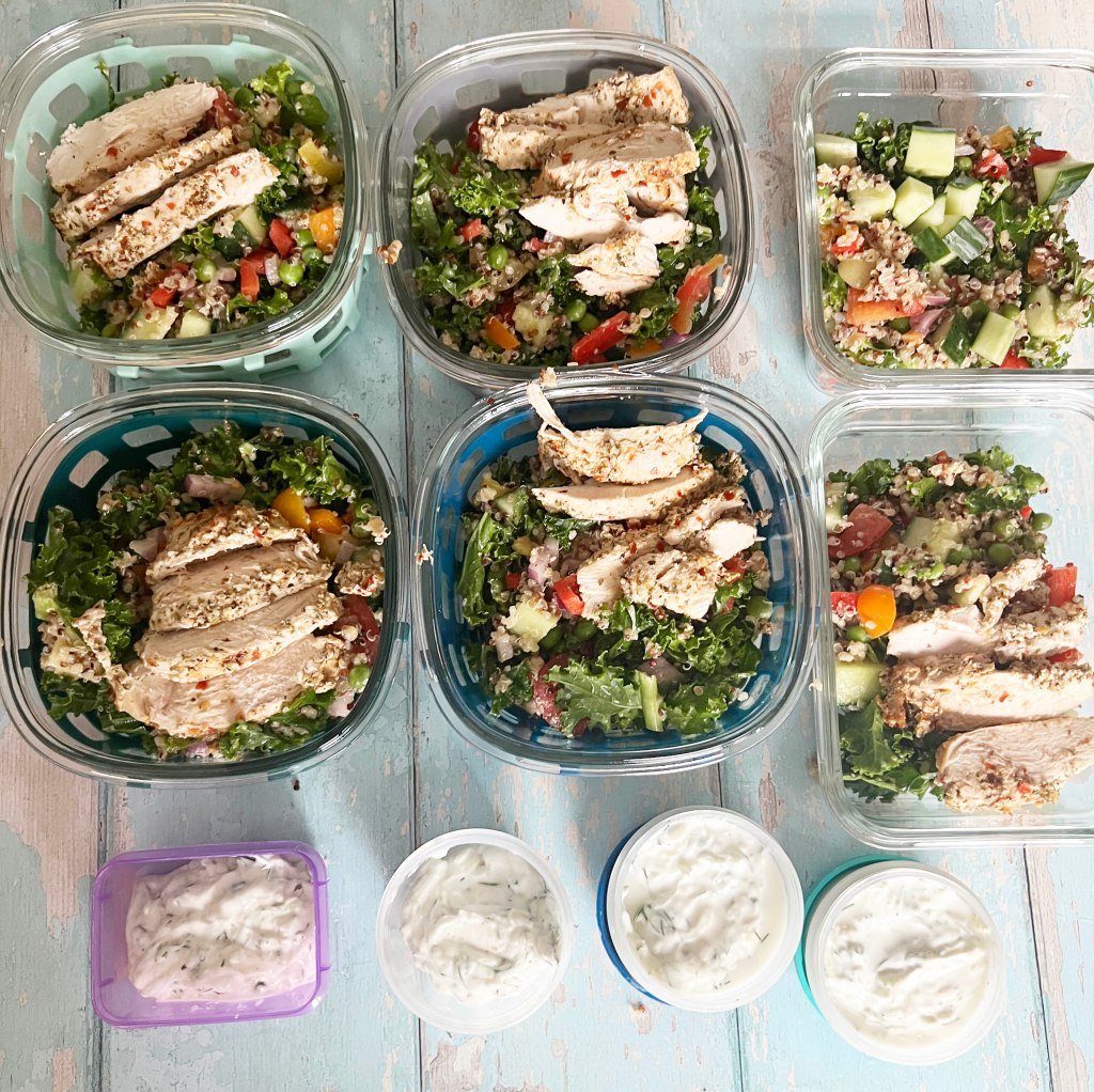 Combine the quinoa, chopped vegetables and dressing in a large bowl and mix well. Divide between 6 containers and top with sliced chicken. Serve with a few tbsps of tzatziki.Salads and tatziki will last up to 5 days in thre fridge – serve with lemon wedges to freshen