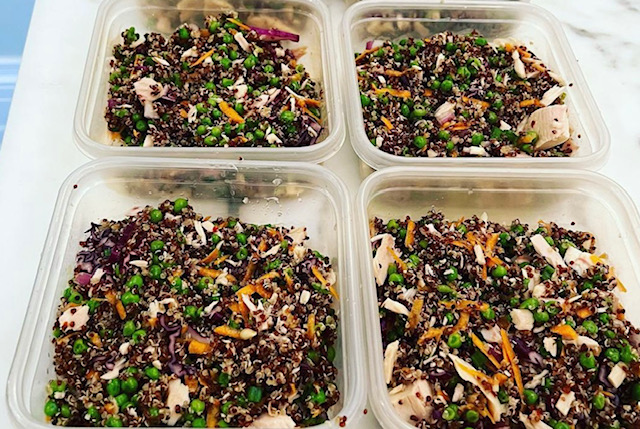 Mix tuna and chopped veggies into quinoa and portion into 4 containers.