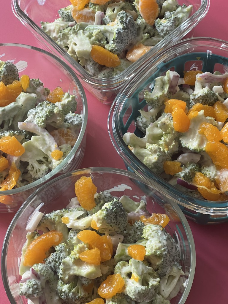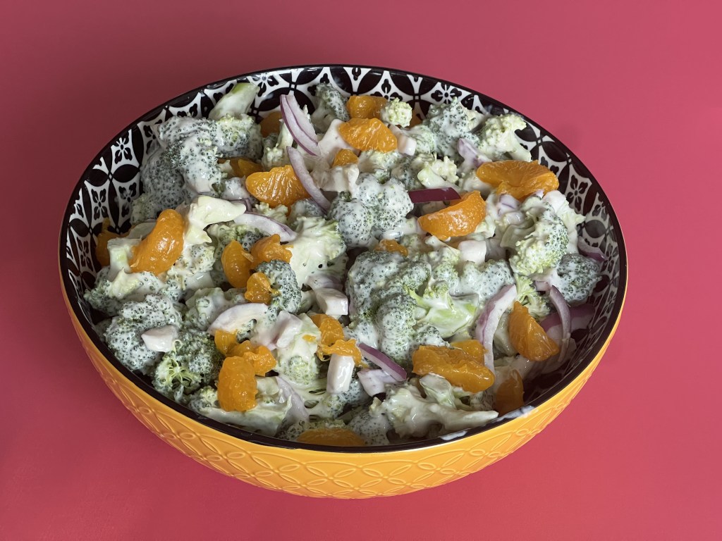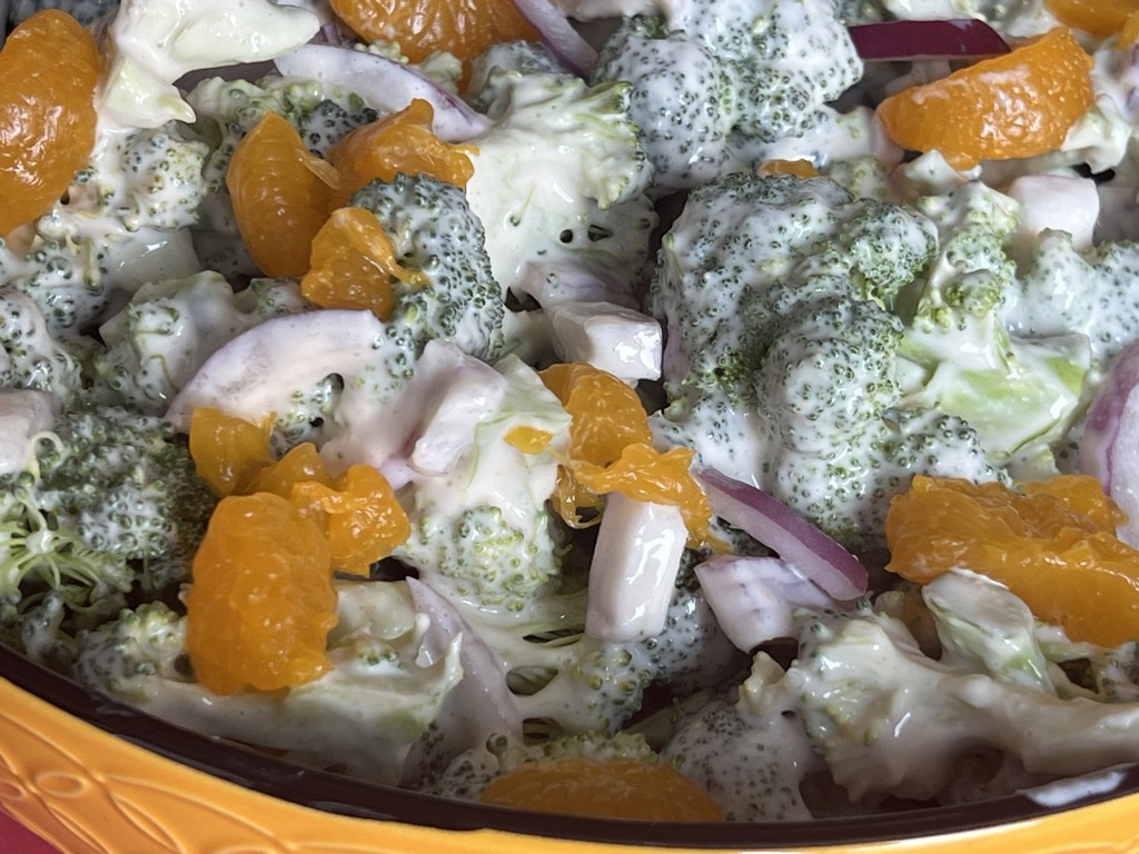 Pour the dressing over the broccoli and onions, mix until the veggies are well coated, then top with mandarin oranges. -