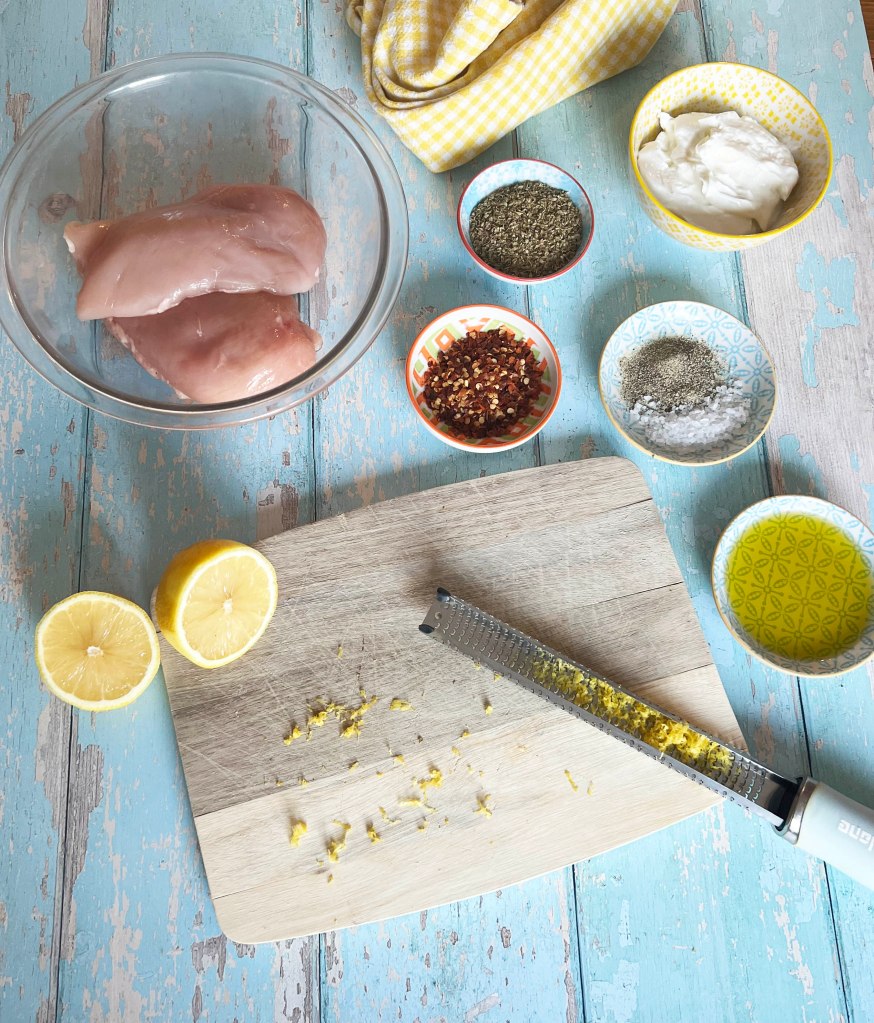 Combine the greek yogurt, oilve oil, oregano, salt & pepper, red chili flakes, lemon zest and juice and cover the chicken in the marinade and refrigerate 3-24 hrs.