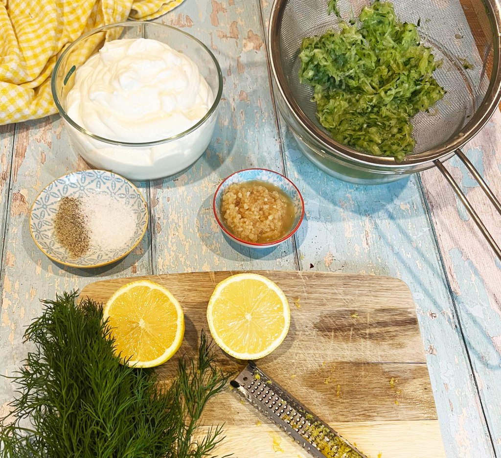 Combine the cucumber, yogurt, garlic, lemon zest & juice and dill. Refriderate until needed.Lemon Vinaigrette
