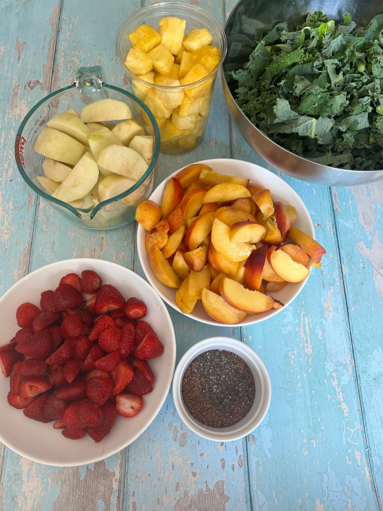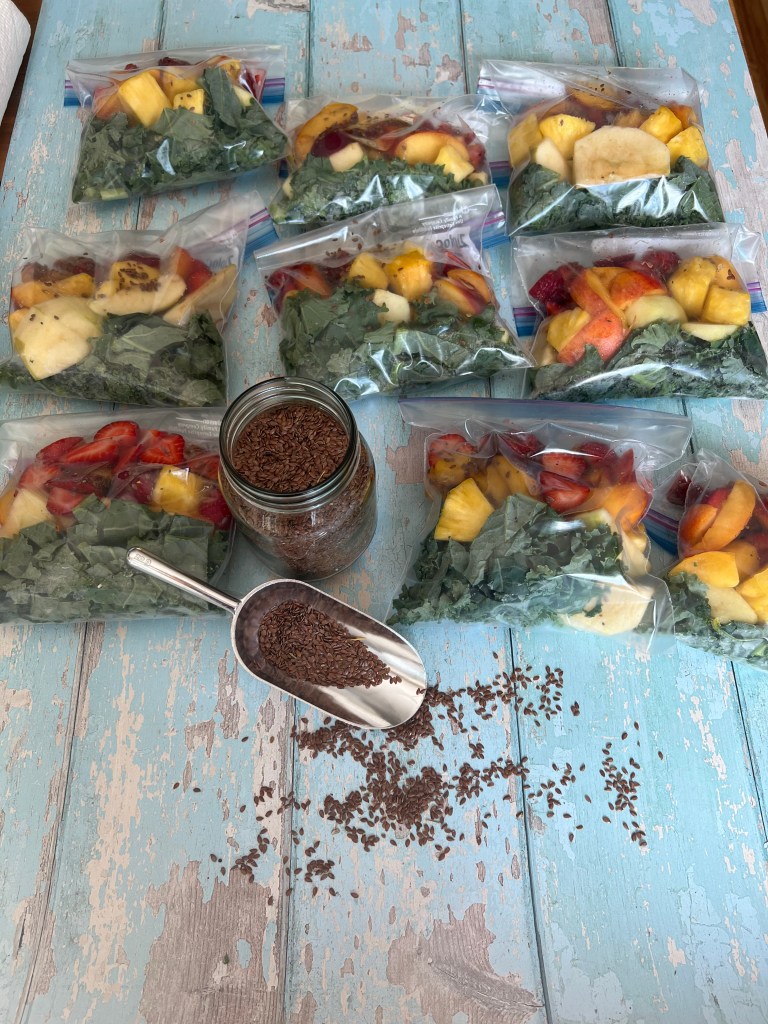 Grab your favourite summer fruits, some kale or spinach, green apple, chia seeds or flaxseed wash chop and divide into individual bags – pop them in the freezer –